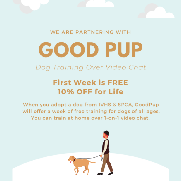 - We are partnering with GoodPup to offer a week of FREE training and 10% off for life when you adopt a dog from IVHS & SPCA.